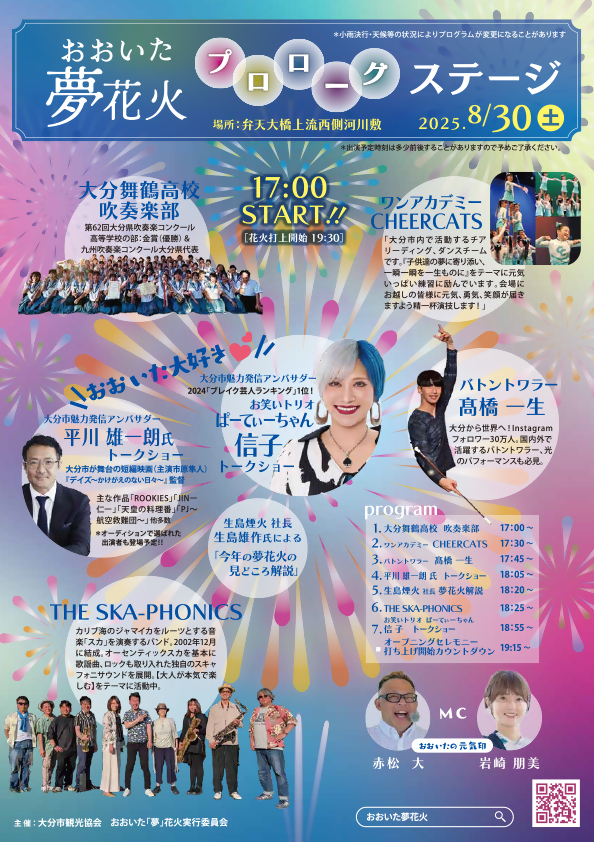 その他、一部ステージプログラムに変更がある場合がございますが、詳細は随時おおいた「夢」花火2024公式サイトおよび公式SNSにてお知らせいたします。