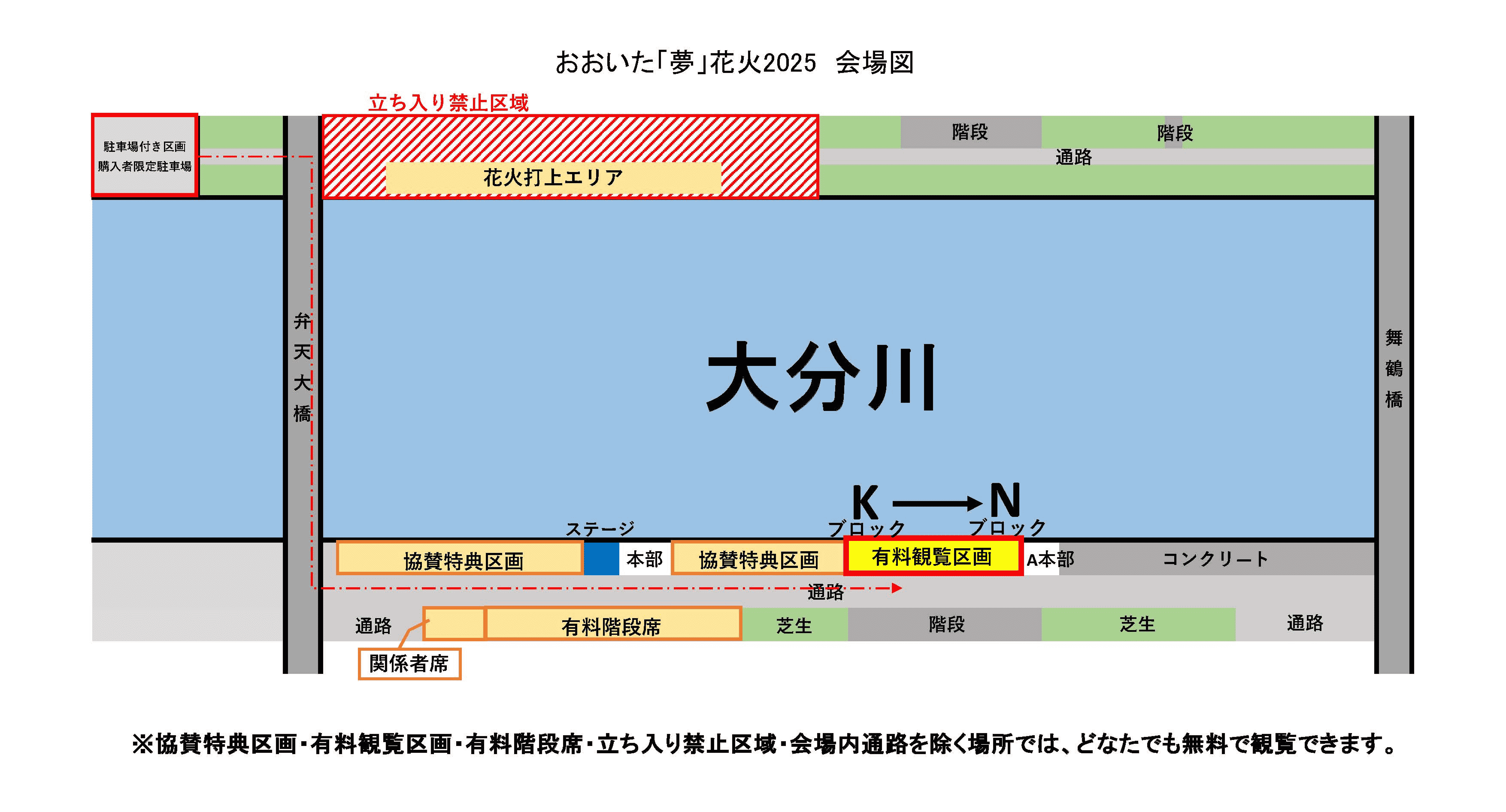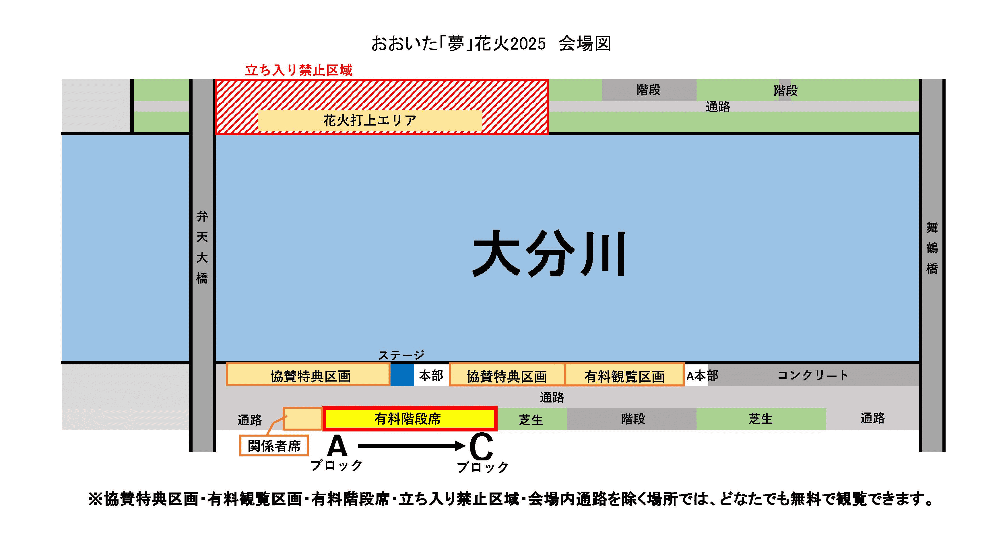 ※協賛特典区画・有料観覧区画・有料階段席・花火打上場所周辺・会場内通路を除く場所では、どなたでも無料で観覧できます。※レジャーシート等、物だけの場所取りはご遠慮ください。